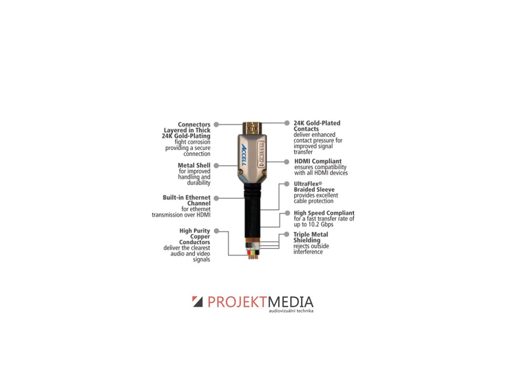 Accell ProUltra® Elite High Speed HDMI kabel + Ethernet B124C je ideální pro použití se všemi HDMI zařízeními i se zařízeními s dřívějšími HDMI verzemi nebo bez Ethernetu, přenáší data až do 10,2 Gbps (340 MHz). Je plně kompatibilní se specifikacemi HDMI High Speed a Ethernetem. Je vybaven Ethernetovým kanálem a zpětným audio kanálem (ARC), což zajišťuje plnou podporu pro nejnovější audio a video formáty. Přenáší 48-bit Deep Color, nebo x.v.Color technologii, ale také DTS-HD nebo Dolby TrueHD HD digitální audio formáty. Tento vysoce výkonný HDMI kabel je navržený tak, aby eliminoval degradaci signálu a zajistil tak lepší reprodukci zvuku a obrazu. 100% fóliové stínění a kovové opletení s vysokou hustotou zcela odstíní elektromagnetické (EM) interference a rádiovou frekvenci (RF). Plášť UltraFlex poskytuje vynikající ochranu kabelu a jeho snadné polohování. Je vybaven HDMI konektory s 24k zlatým pokovováním, což zabraňuje korozi a zajišťuje maximální přenos audia a videa.