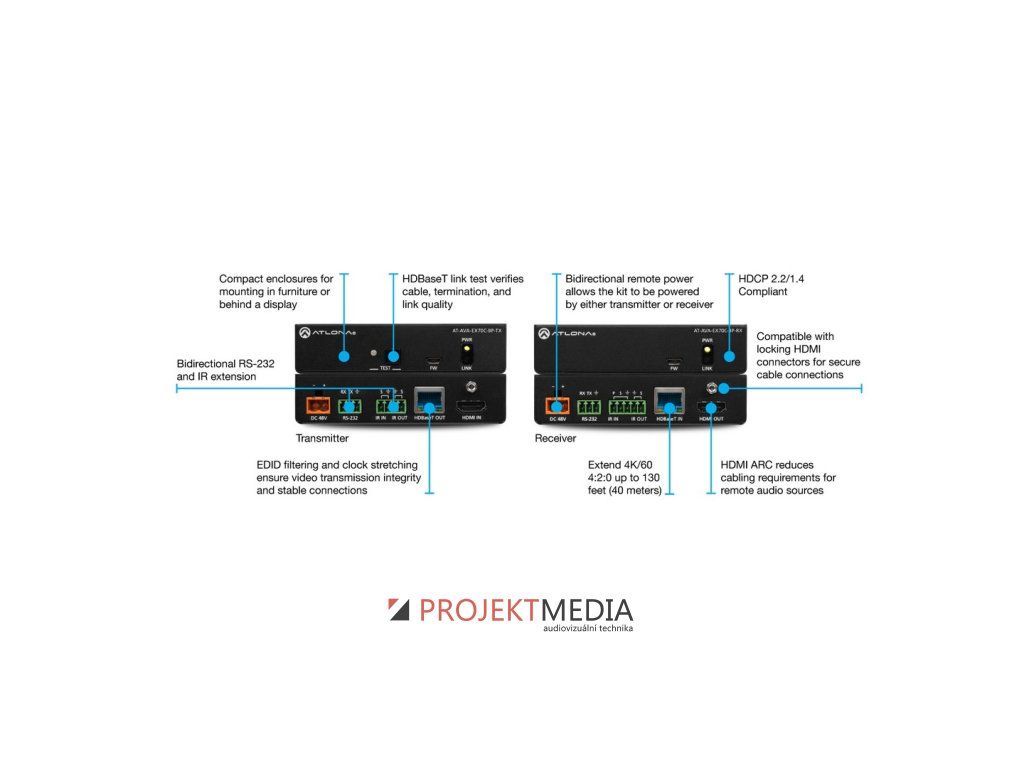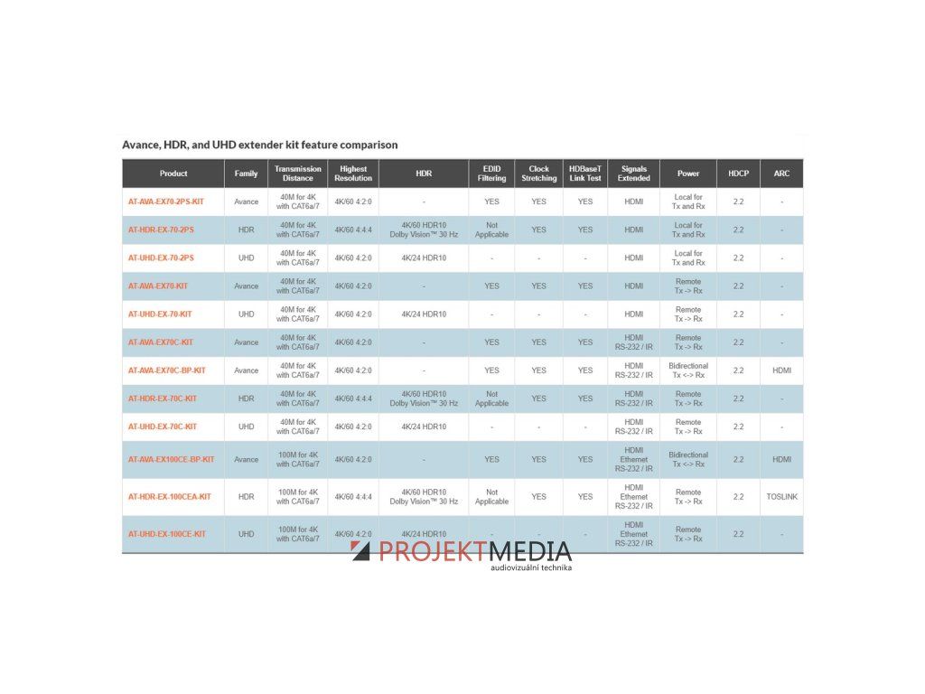 AT-AVA-EX70C-BP-KIT je HDBaseT extender kit, přenáší 4K/UHD 60Hz 4:2:0 až do 40 m, 1080p 60 Hz až do 70 m, podporuje řízení přenos a obousměrného ovládání napájení.