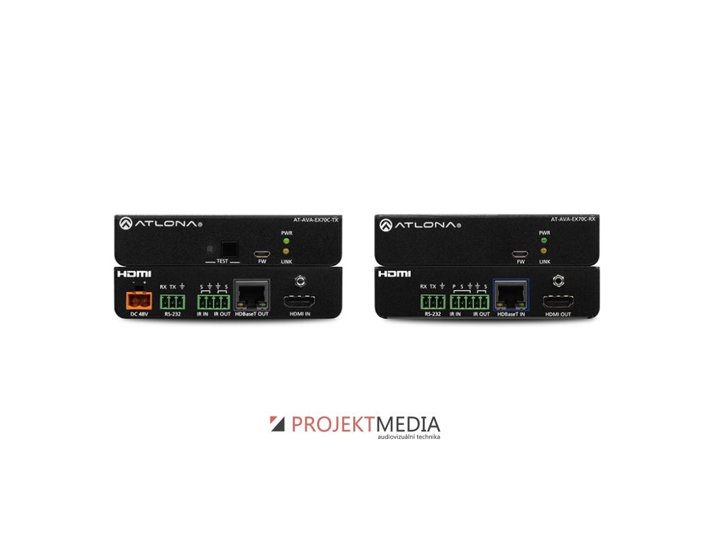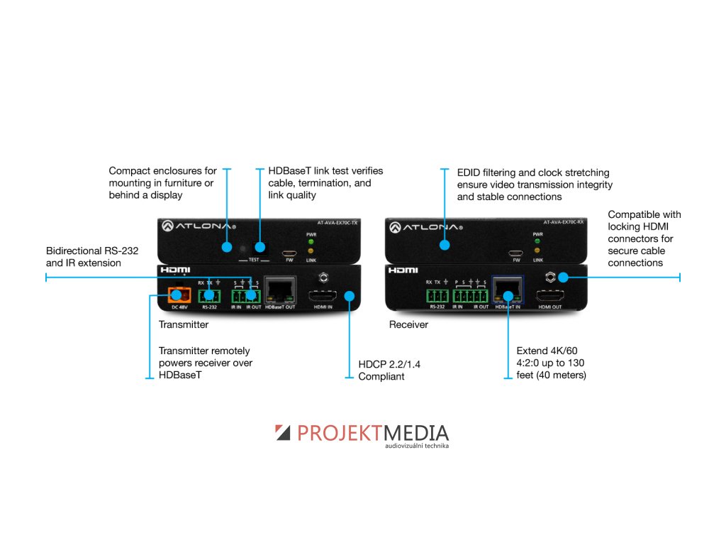 Atlona AT-AVA-EX70C-KIT je zařízení z nové řady Avance™ Series HDBaseT extender kit, který podporuje řízení přenosu a vzdálené napájení. Tato sada přenáší 4K/UHD 60Hz 4:2:0 video až do 40 metrů nebo 1080p 60Hz video až do 70 metrů. Navíc k videu s integrovaným multikanálovým audiem, RS-232, IR řízení signálů a napájení z vysílače do přijímače, je vše podporováno jediným CAT 6/6A/7 kabelem. Díky filtrování Edidu a synchronizaci času je zaručena integrita vysílání videa a stabilní připojení. Integrovaný HDBaseT link test umožňuje rychlé ověření kabelu, koncovky a kvality výstupu. AT-AVA-EX70C-KIT zahrnuje jak koncovku pro přijímač, tak pro vysílač. Kompaktní kryty a držáky umožňují montáž zařízení na povrch v nábytku nebo za displej. AT-AVA-EX70C-KIT poskytuje nákladově efektivní řešení pro rozšíření videa, zvuku, ovládání a napájení přijímače v rozlišení až 4K/UHD.