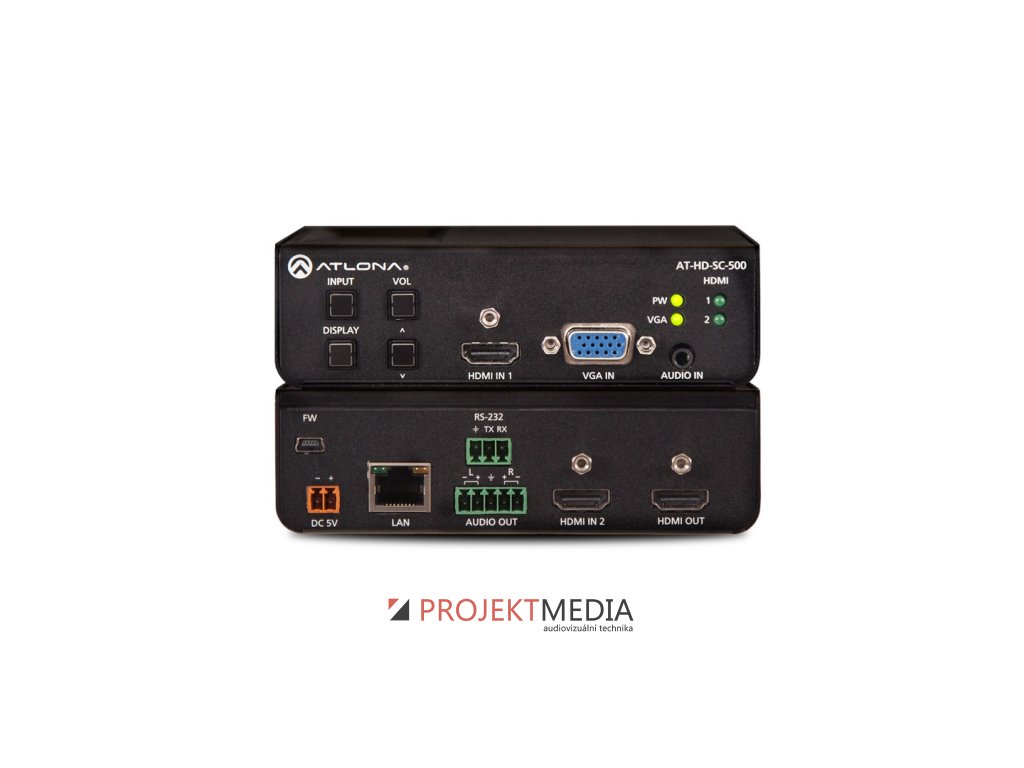 Atlona AT-HD-SC-500 je scaler se zabudovaným 3x1 přepínačem pro HDMI a VGA signály, 2x HDMI vstup, 1x VGA vstup, automatické přepínání, TCP/IP, RS-232, ovládání hlasitosti na předním panelu spolu s volbou vstupu, symetrický audio výstup, audio de-embedding, výrobce: Atlona, model: AT-HD-SC-500