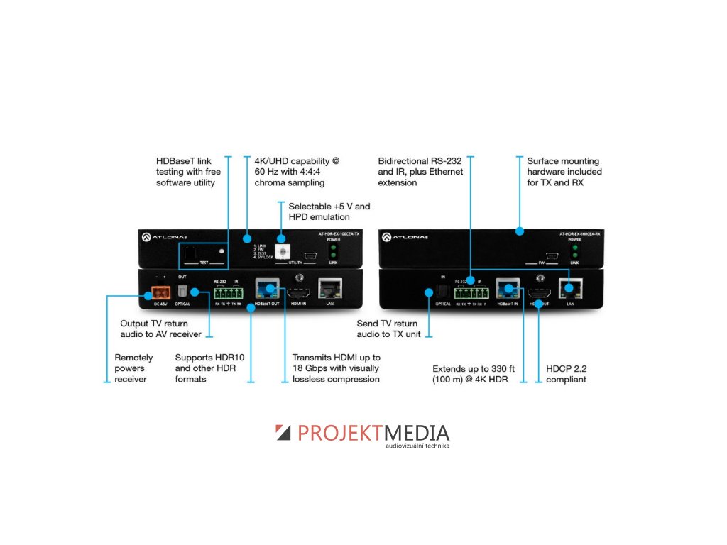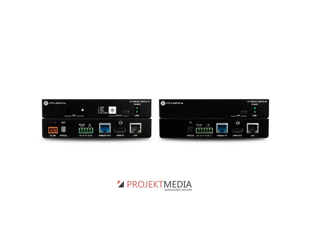 Atlona AT-HDR-EX-100CEA-KIT je HDBaseT sada vysílače a přijímače, která podporuje 4K/UHD/HDR 4:4:4, HDCP 2.2, Ethernet, RS-232, obousměrné IR, dálkově napájený přijímač, přenos HDMI na delší vzdálenost až 100 m, výrobce: Atlona, model: AT-HDR-EX-100CEA-KIT