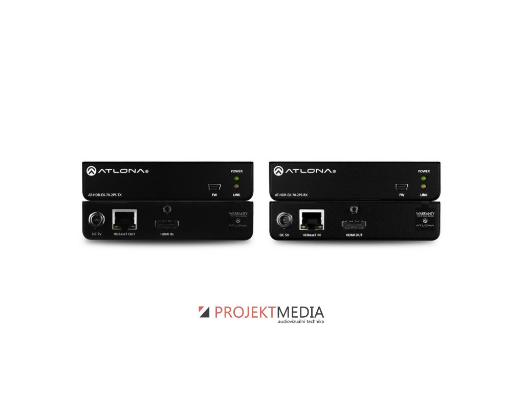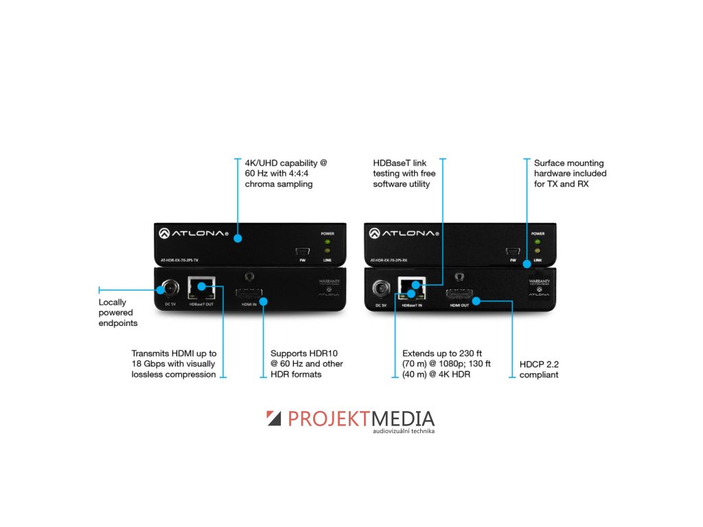 Atlona AT-HDR-EX-70-2PS je KIT HDBaseT™ extenderu pro přenos HDMI® (přijímač/vysílač), podporuje 4K/UHD 60 Hz/4:4:4 včetně HDR, 4K/UHD HDCP 2.2, zvuk PCM, Dolby® a DTS®, HDMI 2.0a, vzdálenost až 70 m, výrobce: Atlona, model: AT-HDR-EX-70-2PS