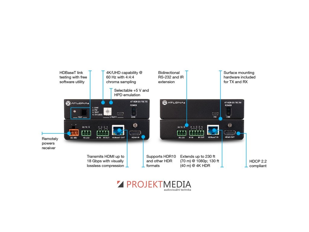 Atlona AT-HDR-EX-70C-KIT je 4K HDR extender HDBaseT KIT vysílače a přijímače, 4K/UHD/60 Hz, 4K HDR, PoE, až do 70 m, RS-232, IR, HDCP 2.2, možnost uchycení do racku, výrobce: Atlona, model: AT-HDR-EX-70C-KIT
