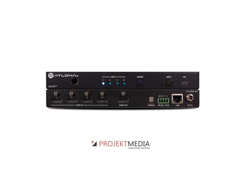 Atlona AT-JUNO-451 je 4x1 HDMI přepínač s podporou HDR, 4K/UHD/60 Hz 4:4:4, HDCP 2.2, automatickou volbou vstupu, TCP/IP, RS-232 a IR ovládáním, ARC, výrobce: Atlona, model: AT-JUNO-451