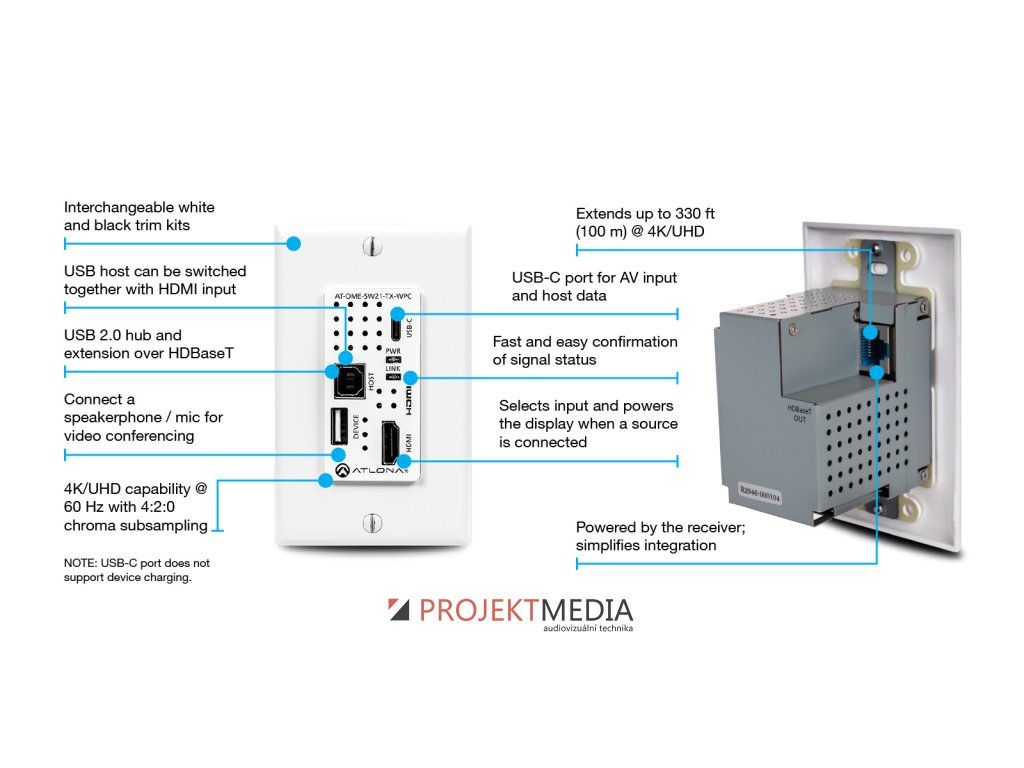 OME-SW21-TX-WPC je vybaven americkým one-gang panelem a zahrnuje výměnné černé a bílé čelní panely. OME-SW21-TX-WPC, součást integračních produktů řady Omega ™ pro moderní AV komunikaci, je kompatibilní s HDCP 2.2. Vstup USB-C je ideální pro propojení AV s novějšími počítači Mac®, Chromebook ™ a Windows®, stejně jako se smartphony a tablety. Je ideální pro softwarové videokonference a dotykové nebo interaktivní displeje s odpovídajícím HDBaseT přijímačem. OME-SW21-TX-WPC nabízí hostitelská rozhraní USB 2.0 a USB-C PC a rozhraní USB 2.0 pro periferní zařízení, jako je telefon, mikrofon nebo klávesnice a myš. Tento vysílač je ideální pro použití s přijímači řady Omega i přepínači se vstupy HDBaseT.