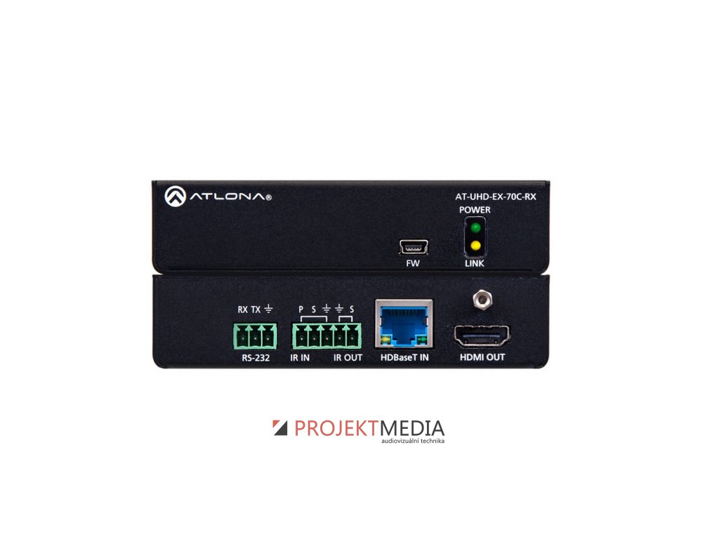 Atlona AT-UHD-EX-70C-RX je 4K/UHD HDMI extender, HDBaseT přijímač s PoE a řízením až do vzdálenosti 70 m, HDCP 2.2, dálkové napájení, obousměrné RS-232, IR, multikanálové audio, LED indikátory, možnost uchycení do racku, výrobce: Atlona, model: AT-UHD-EX-70C-RX