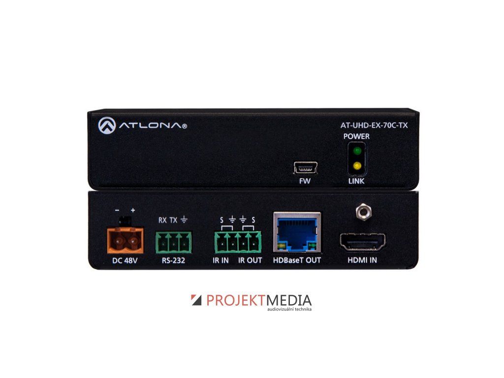 Atlona AT-UHD-EX-70C-TX je 4K HDBaseT vysílač pro přenos HDMI až do vzdálenosti 70m pomocí jednoho CAT kabelu spolu s RS-232 a IR řízením. Přenáší video signál až do 4K/UHD/60Hz s embeddovaným multikanálovým audiem. Vysílač je kompatibilní s HDCP 2.2 a podporuje komunikaci EDIDu. Tento HDBaseT vysílač je externě napájen pomocí přibaleného napájení a je tak vhodným řešením pro přenos AV a řídicích signálů přímo do projektoru s HDBaseT vstupem. AT-UHD-EX-70C-TX lze také použít s Atlona přepínači s HDBaseT vstupy, jako například AT-UHD-CLSO-612ED, AT-UHD-CLSO-824 a AT-UHD-SW-5000ED.