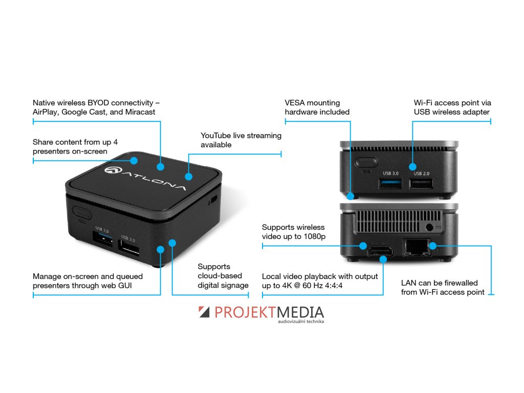 AT-WAVE-101 je platforma pro bezdrátovou prezentaci až čtyř prezentujících současně s HDMI výstupem. Bezdrátový přenos a zrcadlení obrazovky ze zařízení iOS®, AndroidTM, Mac®, ChromebookTM nebo Windows® prostřednictvím protokolů AirPlay®, Google Cast nebo Miracast. Podporuje bezdrátové video až do 1080p / 60 Hz. Výrobce: Atlona, model: AT-WAVE-101