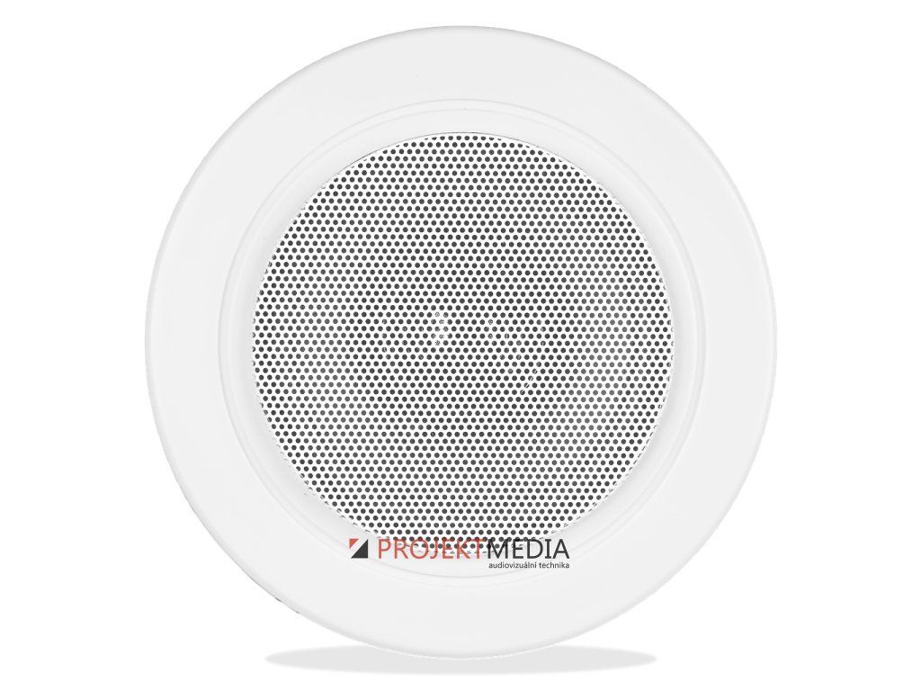 Stropní reproduktor pro prostředí s vysokou vlhkostí / stříkající vodou, 10/6W @ 8 Ohm / 6W @ 100V, max. SPL 95dB @ 1m, frekvenční rozsah 100Hz-15kHz, ABS plast, IP65, rozměry 140 x 149mm, výřez 125mm, bílý