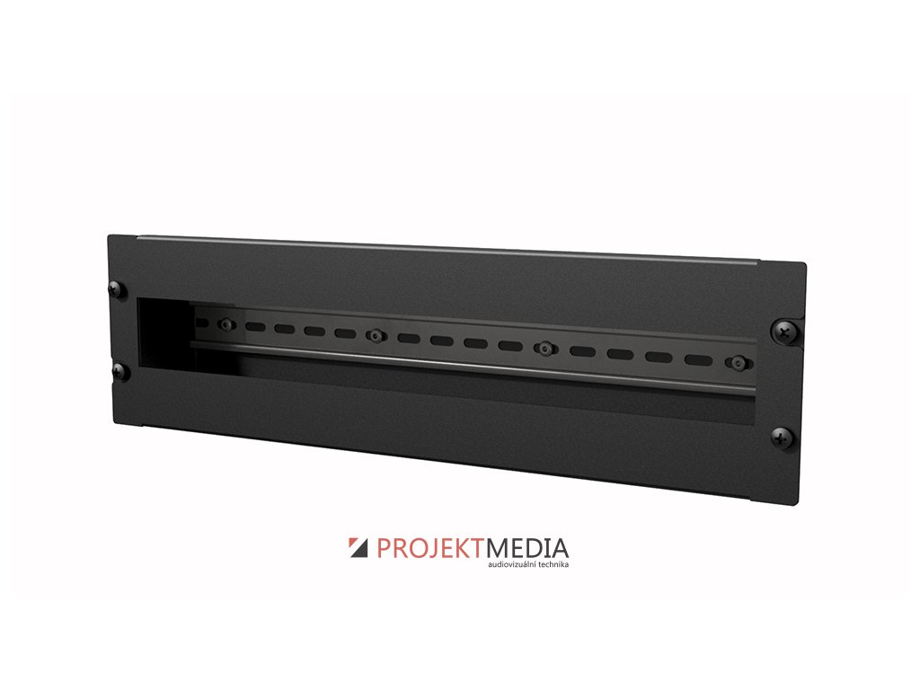 19" montážní panel 3U se zapuštěnou DIN lištou, odnímatelný kovový kryt, příprava pro vyvázání kabeláže k DIN přístrojům nahoře i dole, dodávka vč. Záslepek