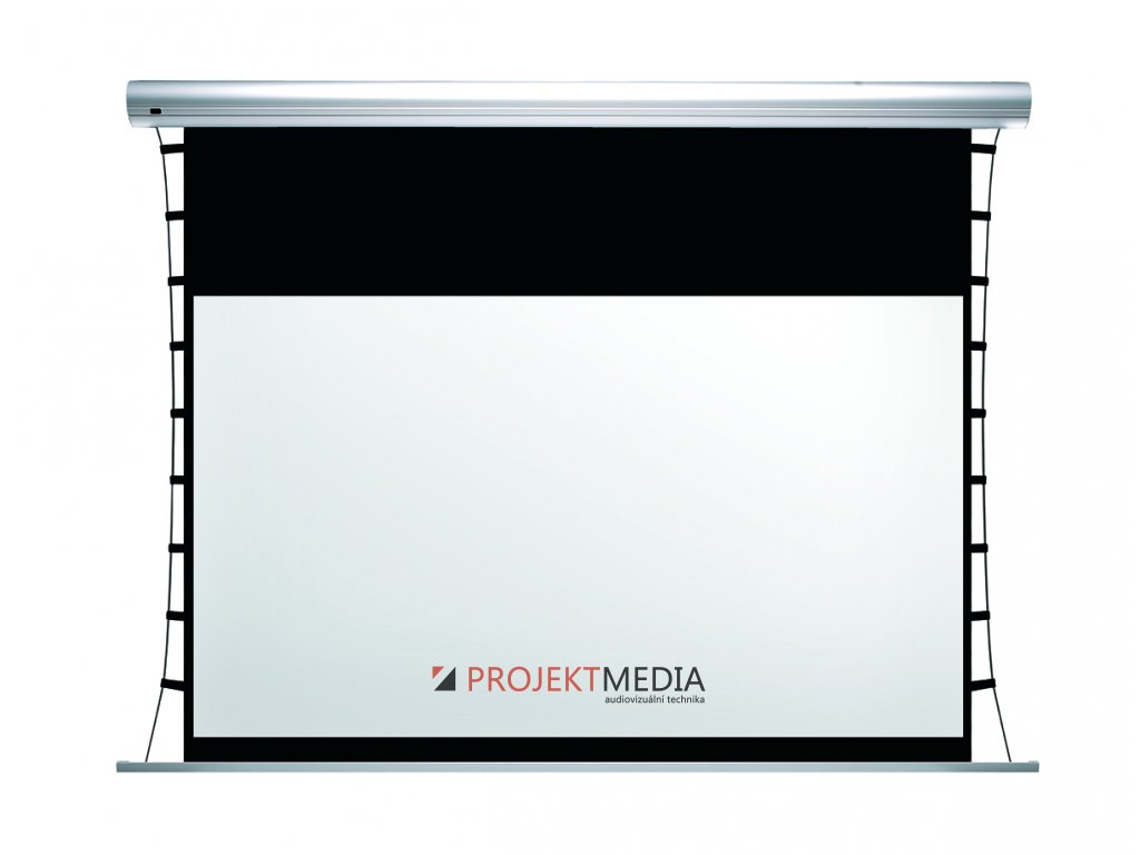 Kvalitní elektrické projekční plátno řady BlueLabel s pohonnou jednotkou Somfy, v provedení BlackTop (černý rámeček okolo obrazu s horním 30cm okrajem) s bočním napínacím mechanizmem. Tubus plátna z eloxovaného hliníku.