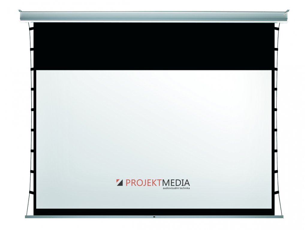 Kvalitní podhledové projekční plátno řady BlueLabel s pohonnou jednotkou Somfy, v provedení BlackTop (černý rámeček okolo obrazu s horním 30cm okrajem) s bočním napínacím mechanizmem. Tubus plátna z eloxovaného hliníku bíle lakovaný.