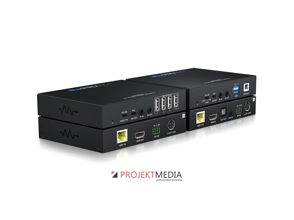 Blustream HEX70USB-KIT je 4K HDBaseT™ USB 2.0 extender kit, který přenáší HDMI signál až do vzdálenosti 70m (4K 60Hz 4:2:0 do 40m), podporuje USB 2.0, obousměrné IR a RS-232, HDMI audio breakout, obousměrné PoC, EDID management a je kompatibilní s HDCP2.2. výrobce: Blustream, model: HEX70USB-KIT