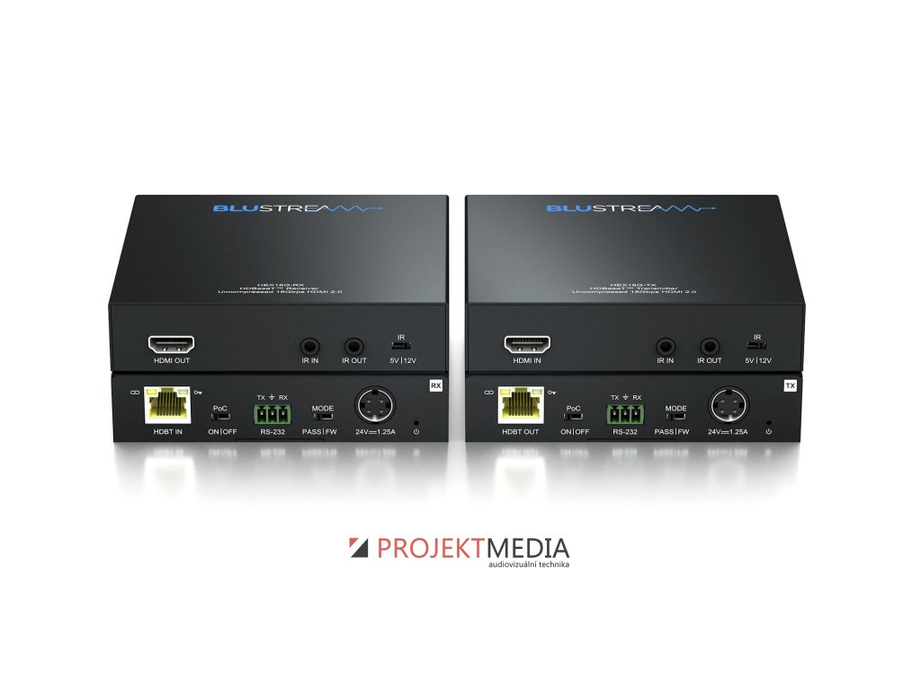 Blustream HEX18G-KIT sada HDBaseT™ vysílače a přijímače přenášejícím HDMI2.0 s použitím HDBaseT™ chipsetu VS3000 pro přenos HDMI 18Gb/s signálů až do 4K 60Hz 4:4:4 včetně všech HDR formátů. Podpora obousměrných IR, RS-232 a PoC až do 100 metrů přes CAT kabel. Výrobce: Blustream, model: HEX18G-KIT
