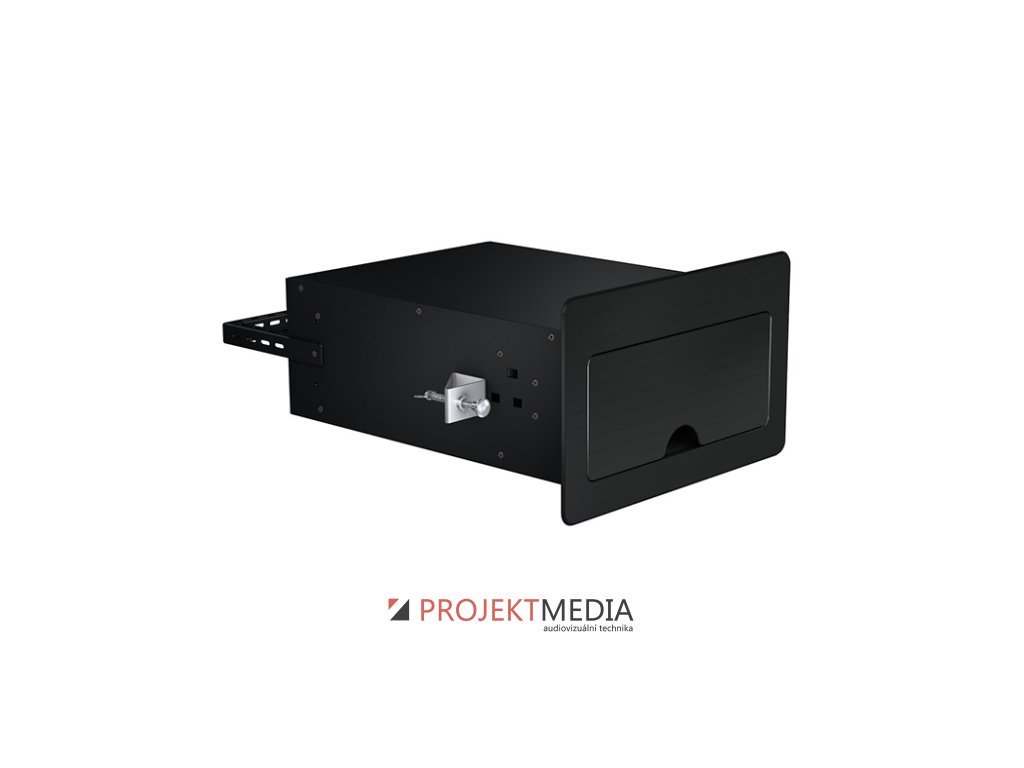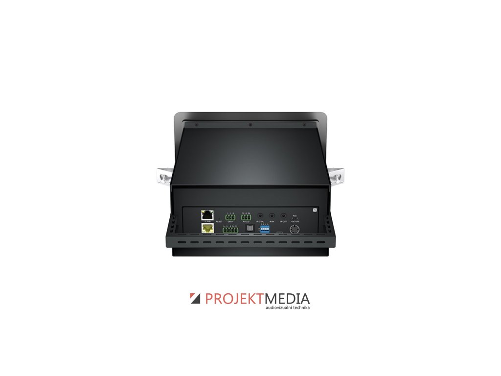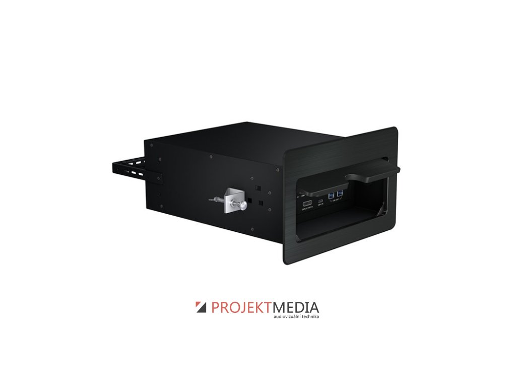 HEX70HDUK-TT je stolní kryt navržený tak, aby poskytoval bezpečné řešení pro montáž vysílače HEX70HDUK do desky stolu. Toto atraktivní prostorově úsporné řešení je vyrobeno z vysoce kvalitní oceli s estetickým černým předním panelem z broušeného hliníku. HEX70HDUK-TT zahrnuje sklopná dvířka, které zajišťují jednoduchý přístup k portům a ovládacím tlačítkům vysílače HEX70HDUK. Zařízení je dodáváno s univerzálním držákem pro správu kabelů a držáky pro montáž pro bezpečnou a přitom snadnou instalaci do stolu v zasedací místnosti.