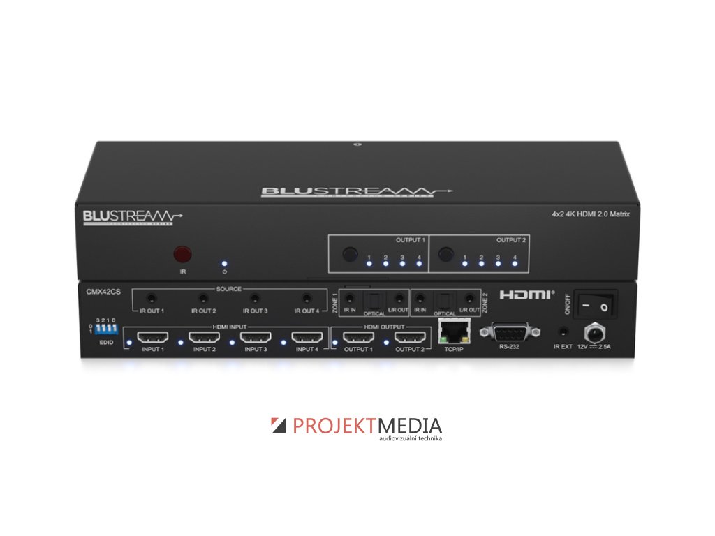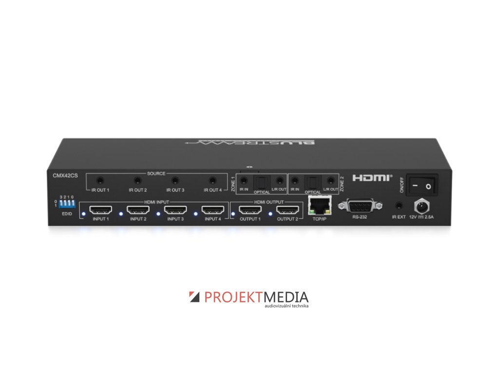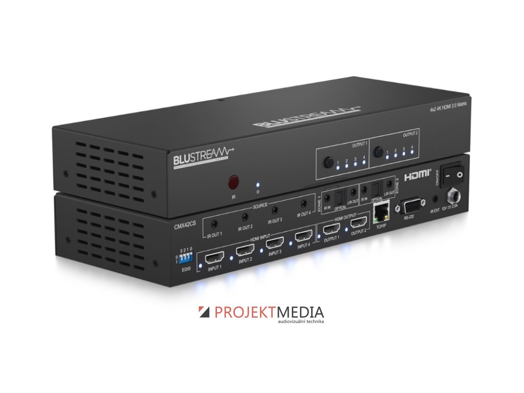 Blustream CMX42CS je profesionální 4x2 HDMI 2.0 maticový přepínač umožňující směrování až čtyř HDMI zdrojů na dva nezávislé výstupy ve 4K UHD rozlišení při 60 Hz (4:4:4). Podporuje HDR, HDCP 2.2, širokou škálu video a audio formátů včetně Dolby TrueHD a DTS-HD MA. Nabízí funkce pro snižování rozlišení, EDID správu a flexibilní ovládání přes přední panel, TCP/IP, IR a RS-232. Ideální pro rezidenční a komerční AV instalace. Výrobce: Blustream, model: CMX42CS
