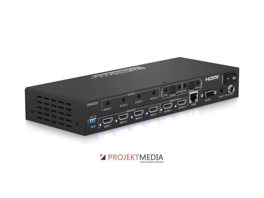 Díky plné podpoře HDMI 2.0 s HDCP 2.2 umožňuje CMX42CS spolehlivou distribuci až čtyř zdrojových zařízení HDMI na dva nezávislé HDMI výstupy. Jsou podporována všechna video rozlišení až do 4K UHD při 60Hz 4:4:4 (18 Gbps), což zajišťuje plnou kompatibilitu s nejnovějším UHD a HDR obsahem.