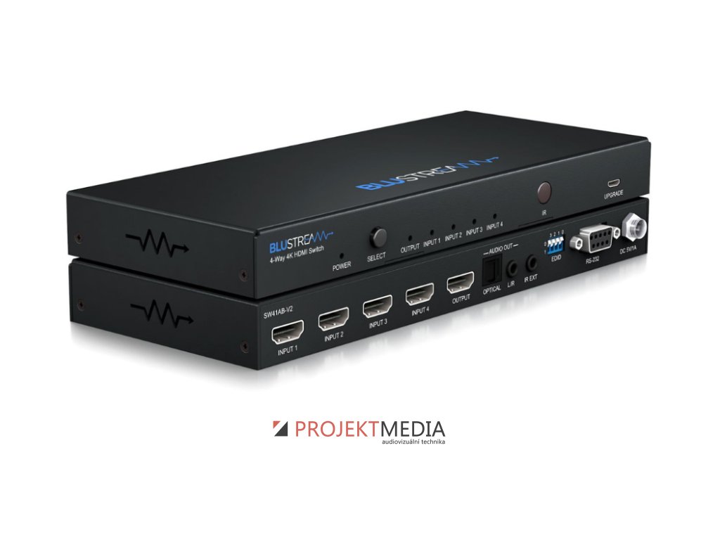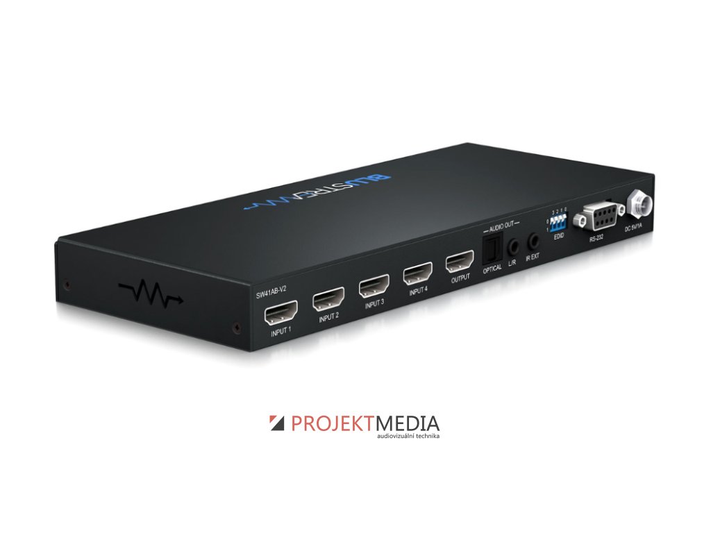 Blustream SW41AB-V2 je HDMI přepínač se 4 HDMI vstupy a 1 HDMI výstupem s integrovaným audio breakoutem, možnost automatického přepínání HDMI vstupů, podpora HDMI 2.0 a HDCP 2.2 s rozlišením až do 4K 60Hz 4:4:4, výrobce: Blustream, model: SW41AB-V2