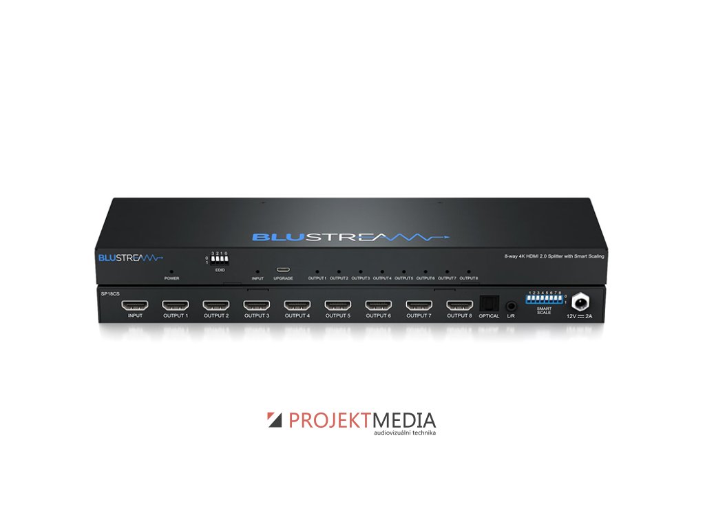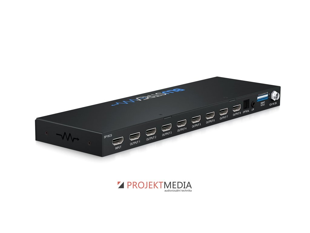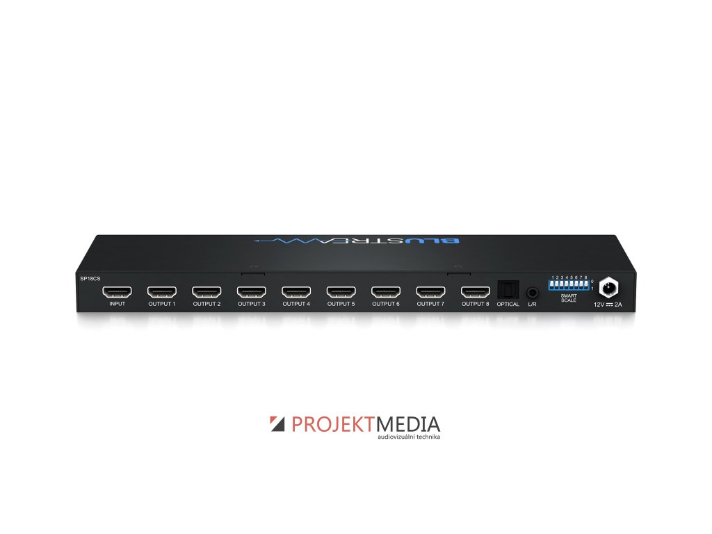 Blustream SP18CS je 4K HDMI 2.0 rozbočovač 1x8, který přenáší 1 HDMI zdroj do 8 výstupů současně s digitálním (S/PDIF) a analogovým audio breakoutem. Podporuje HDMI 2.0 a HDCP 2.2 s rozlišením až 4K 60Hz 4:4:4 s automatickou konverzí obrazu na každém výstupu. Výrobce: Blustream, model: SP18CS