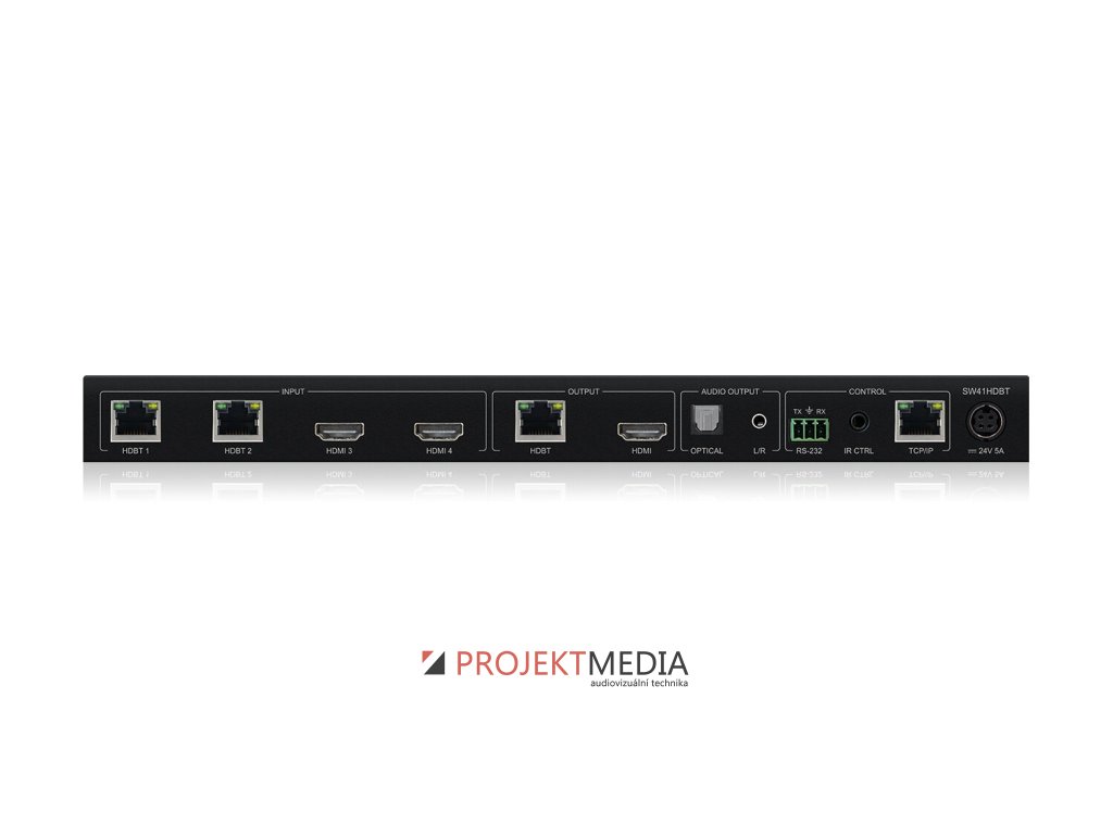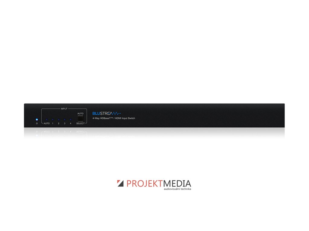 Blustream SW41HDBT je 4x1 přepínač 2 x HDBaseT / 2 x HDMI vstupů 4:4:4, simultánní 1 x HDMI / 1 x HDBaseT výstup, manuální / automatické přepínání zdrojů, PoC na TX a RX, audio breakout, webové GUI s ovládáním CEC zdroje a displeje. výrobce: Blustream, model: SW41HDBT