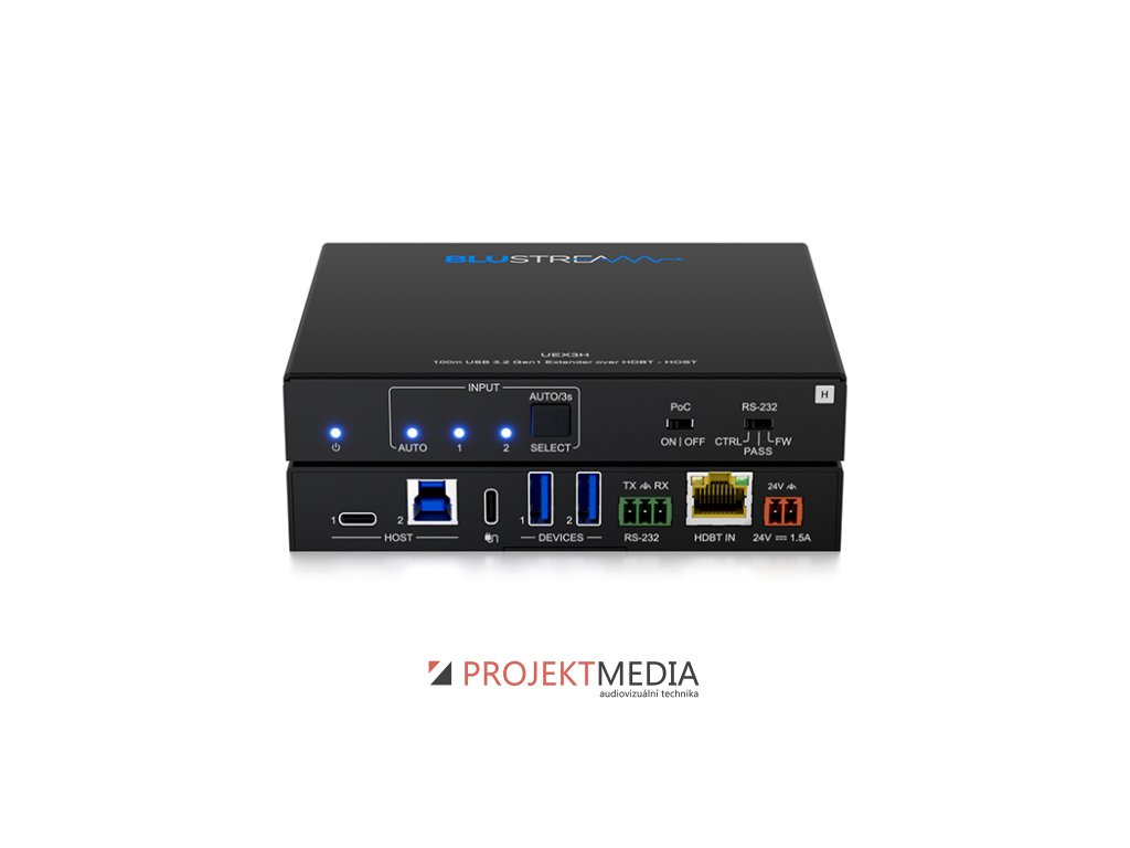 UEX3H je USB Host řešení, které využívá technologii HDBaseT™ k umožnění vzdáleného připojení zařízení USB 3.2 Gen1 na vzdálenost až 100 metrů pomocí jediného kabelu CAT6A. UEX3H umožňuje přepínání 2x USB Hostů mezi 2 lokálními USB zařízeními, stejně jako mezi zařízeními připojenými ke vzdálenému kompatibilnímu Blustream USB HDBaseT vysílači s podporou datové šířky pásma až 5 Gb/s.