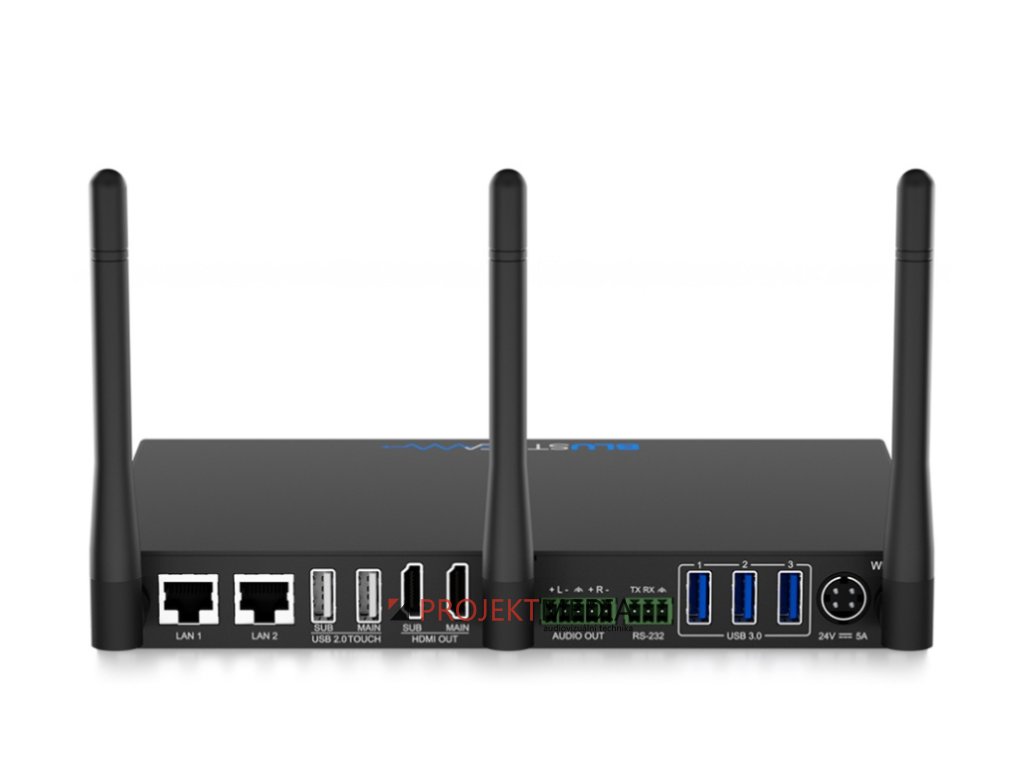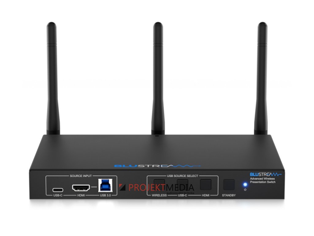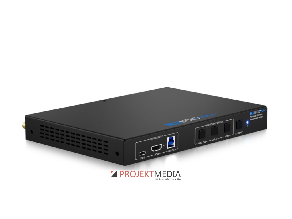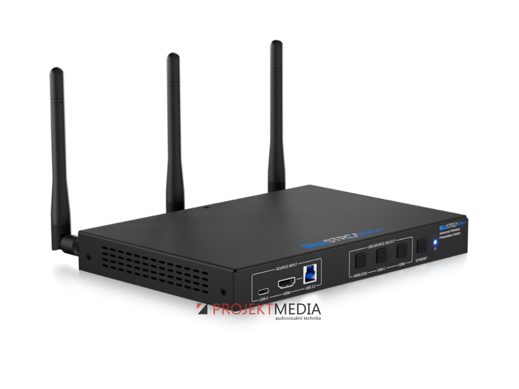 Obsahuje HDMI, USB-C, AirPlay, Miracast®, Chromecast® a podporu bezdrátového hardwarového klíče Blustream, kterou lze přepnout na dva výstupy HDMI