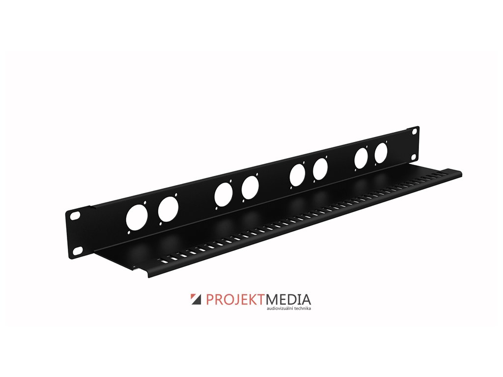 Panel 19" 1U pro osazení konektorů, 8x otvor D-size, příprava pro vyvázání kabelů, materiál ocel tl. 1,5mm, barva černá