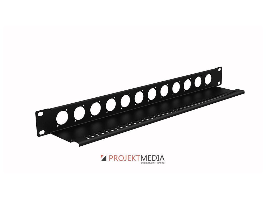 Panel 19" 1U pro osazení konektorů, 12x otvor D-size, příprava pro vyvázání kabelů, materiál ocel tl. 1,5mm, barva černá
