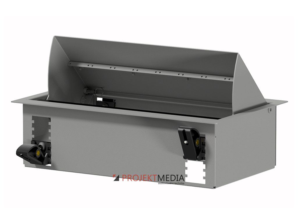 Přípojná jednotka systému CASY o celkové šířce max. 8 jednotek, provedení pro zapuštěnou instalaci do stolu / nábytku / duté příčky s tloušťkou desky v rozsahu 6-50mm, výklopný systém s možností otevření krytu do úhlu 45°. Pohodlný přívod kabelů otevřenou spodní/zadní stranou, snadné a stabilní upevnění do podkladové desky bez nutnosti přístupu vzadu. Tělo z ocelového plechu tl. 1,5mm, povrchová úprava odolný práškový lak. Rozměry (ŠxVxH) 322x198x91.5mm, instalační otvor 305x175mm, hmotnost 2,1kg, barva šedá.