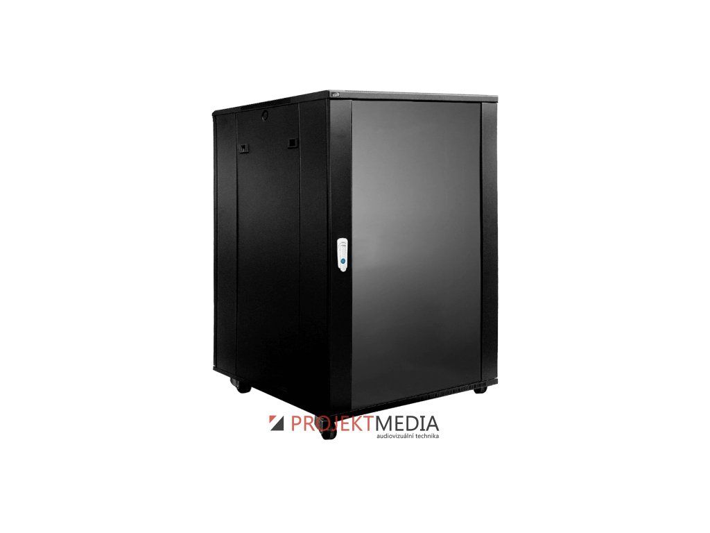 19" rozvaděč 18U dle ANSI/EIA RS-310D, DIN41491 a IEC60297, 600x800mm (ŠxH), barva černá RAL9004. Přední dveře s temperovaným sklem, přední i zadní dveře se zámkem a zavěšením na pantech s možností změny orientace, odnímatelné bočnice pro snadný přístup ze strany. Hloubkově posuvné přední i zadní 19" profily s číslováním pozic pro rychlou orientaci, nastavitelná vzdálenost až 740mm. Pevná svařovaná konstrukce ze za studena válcované oceli tl. 2mm (rám) / 1,2mm (plechy), max. zatížení 800kg stat. (na nohách) / 400kg dyn. (na kolečkách). Dodávka v kompletně sestaveném stavu, součástí dodávky 50mm transportní kolečka, stavitelné nohy a sada montážního materálu pro 19" zařízení.