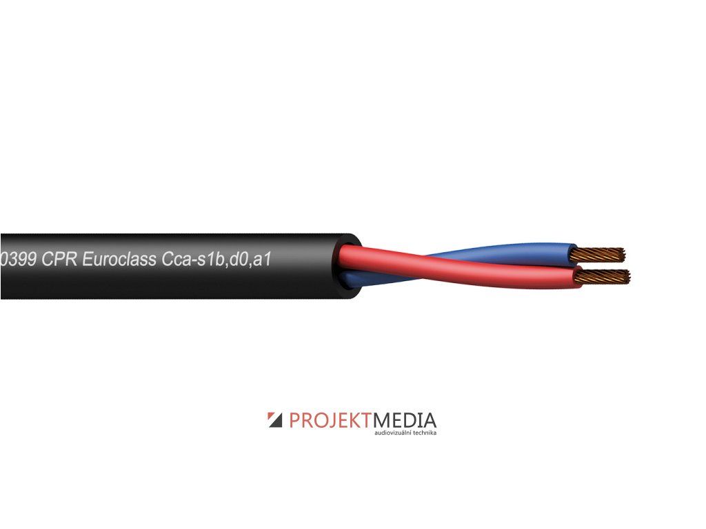 Reproduktorový kabel v souladu s Nařízením o stavebních výrobcích 305/2011/EU (CPR), EN50575, EN50399, třída reakce na oheň Cca-s1b,d0,a1, bezhalogenový. Průřez 2 x 1,5 mm² / 16 AWG, kroucené laněné vodiče z bezkyslíkaté mědi s 28 vlákny o průměru 0,25mm v každém vodiči. Stejnosměrný odpor 1,33 Ohmu / 100m, jmen. napětí 500V, dielektr. pevnost 2 kV/min (ss). Vnější průměr 7mm, potisk pláště s délkovými značkami á 1m. Návin 100m.