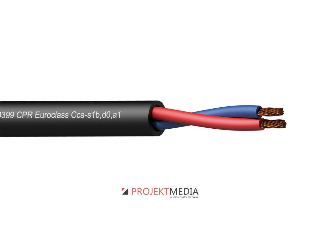 Reproduktorový kabel v souladu s Nařízením o stavebních výrobcích 305/2011/EU (CPR), EN50575, EN50399, třída reakce na oheň Cca-s1b,d0,a1, bezhalogenový. Průřez 2 x 2,5 mm² / 13 AWG, kroucené laněné vodiče z bezkyslíkaté mědi se 40 vlákny o průměru 0,263mm v každém vodiči. Stejnosměrný odpor 0,798 Ohmu / 100m, jmen. napětí 500V, dielektr. pevnost 2 kV/min (ss). Vnější průměr 8,5mm, potisk pláště s délkovými značkami á 1m. Návin 100m.