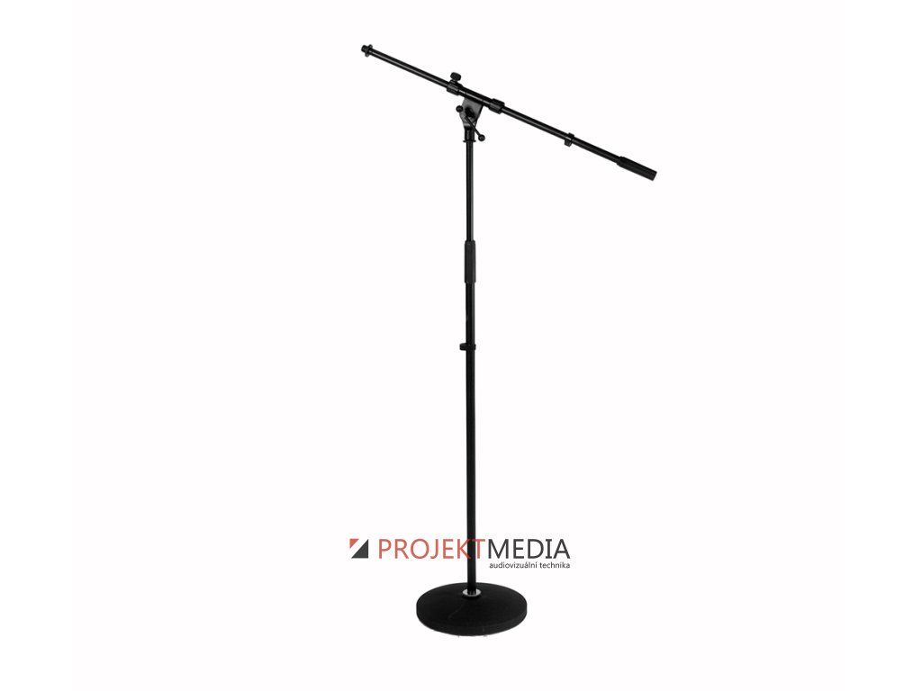 Mikrofonní stativ s ramenem, nastavitelná výška v rozsahu 830-1540mm, délka ramene 800mm, kruhová základna Ø 250mm. Součástí dodávky závitová redukce 5/8"-3/8" a klip pro uchycení kabelu. Materiál ocel, základna litina, hmotnost 3,78kg, barva černá.