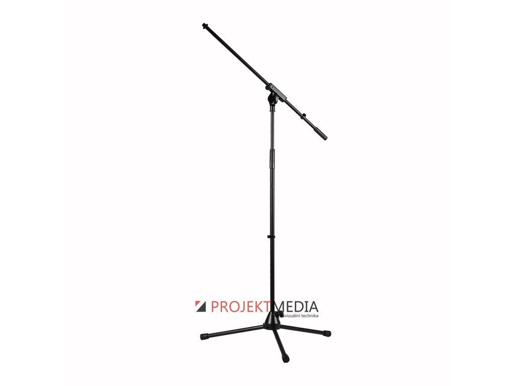 Mikrofonní stativ s ramenem, nastavitelná výška v rozsahu 1000-1760mm, délka ramene 800mm, základna skládací trojnožka s délkou nohy 330mm. Součástí dodávky závitová redukce 5/8"-3/8" a klip pro uchycení kabelu. Materiál ocel, hmotnost 3,2kg, barva černá.