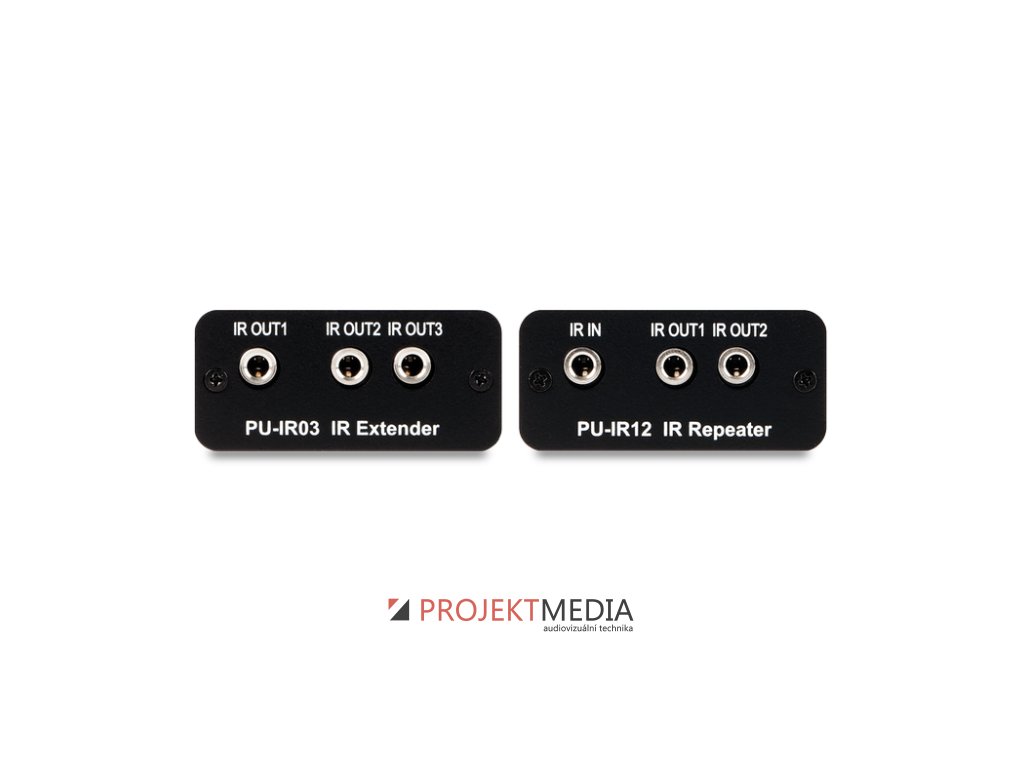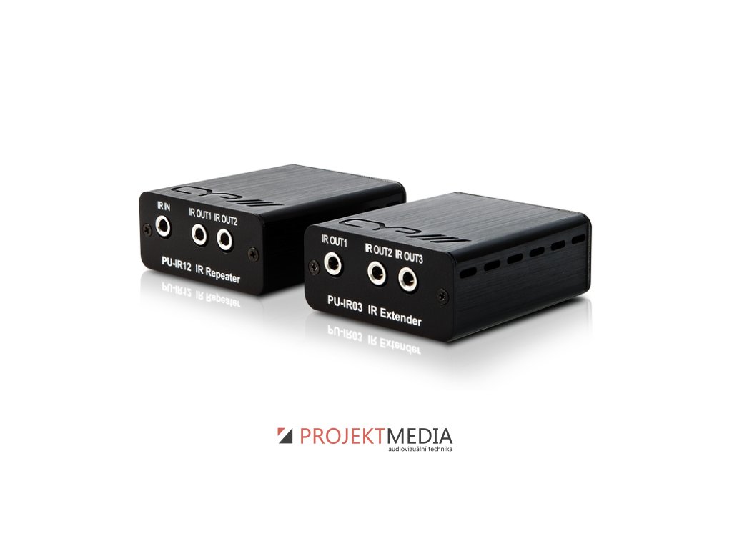 PU-IR01-KIT je IR sada, která zajišťuje ovládání až 5 zdrojových zařízení, 2 zdrojové zařízení mohou být ovládána přes repeater a 3 přes extender a to až na vzdálenost 250m přes kabel CAT5/6. IR sada PU-IR01-KIT rozšiřuje vzdálenost o kterou je možné zařízení ovládat jejich vlastním dálkovým ovládačem.