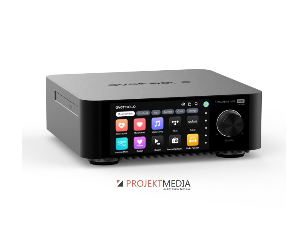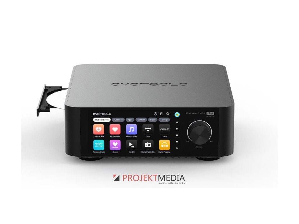 Eversolo Play CD Edition je streamovací audio systém se zesilovačem třídy D (2x 110 W RMS při 4Ω) s DAC (D/A převodník AK4493SEQ) a CD mechanikou. Streamuje z TIDAL, Qobuz, Spotify i NAS. HDMI ARC, PHONO, USB Audio Out. Dotykový displej 5,5", multiroom, kalibrace zvuku i ovládání přes aplikaci. Výrobce: Eversolo, Model: Eversolo Play CD Edition