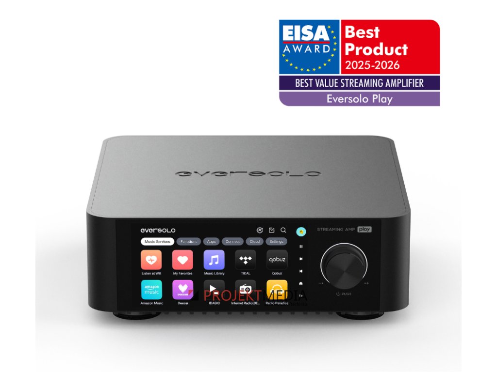 Eversolo Play je streamovací audio systém se zesilovačem třídy D (60 W RMS při 8Ω) s DAC (D/A převodník AK4493SEQ). Streamuje z TIDAL, Qobuz, Spotify i NAS. HDMI ARC, PHONO, USB Audio Out. Dotykový displej, multiroom, kalibrace zvuku i ovládání přes aplikaci. Výrobce: Eversolo, Model: Eversolo Play