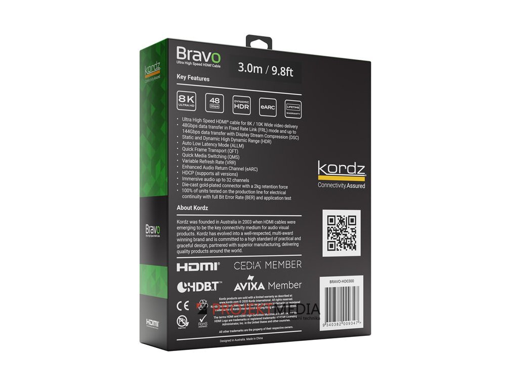Kordz 8K HDMI 2.1 kabel řady BRAVO je vysokorychlostní HDMI kabel, HDMI certifikace zajišťuje 48Gb/s a až 10K video. Jedinečně zhotovené konektory zabraňují výpadkům, Výrobce: Kordz, model: BRAVO-HD