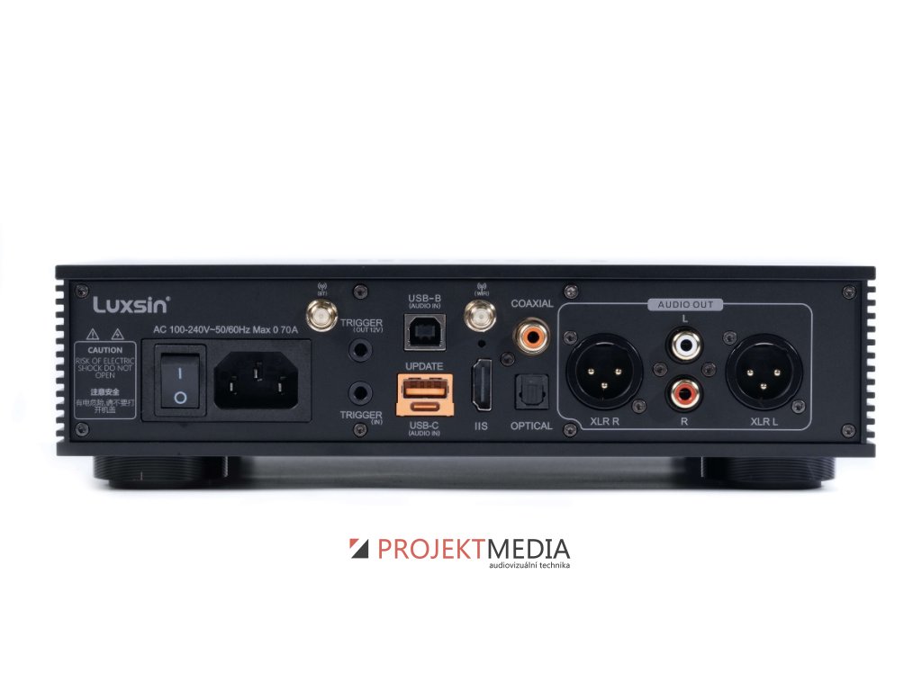USB-B/C, optika, koaxiál a IIS. IIS podporuje více konfigurací pro kompatibilitu s různými zdroji. K dispozici je i 12V Trigger in/out.