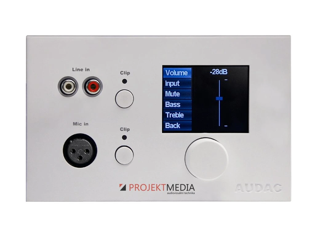 Nástěnný ovládací a přípojný panel, 2,5" barevný grafický displej, otočný enkodér pro pohyb v menu a nastavení, 1x vstup Mic (XLR) + 1x vstup Line (stereo RCA) s nezávislou regulací úrovně a indikací přebuzení, bílý