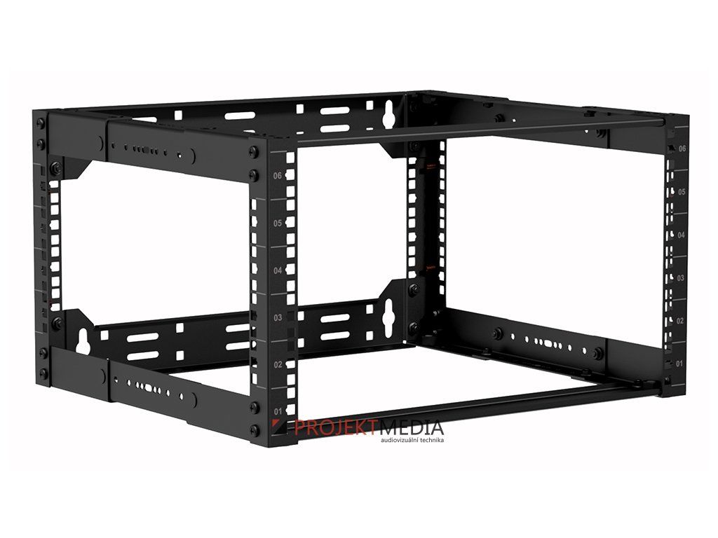 Rozvaděč 19" otevřený 6U pro stojanovou / nástěnnou / stropní instalaci nebo vestavbu do nábytku, hloubka nastavitelná v rozsahu 300-450mm, číslované výškové pozice. Materiál ocel tl. 2mm, nosnost 100kg (stojící) / 50kg (zavěšený), rozebíratelný, dodávka v rozloženém stavu. Součástí balení 4x stavitelná noha, 4x kotva do zdi M8, 24x sada klecová matka + šroub. Rozměry (ŠxVxH) 520x291x300-450mm, hmotnost 8kg, barva černá.