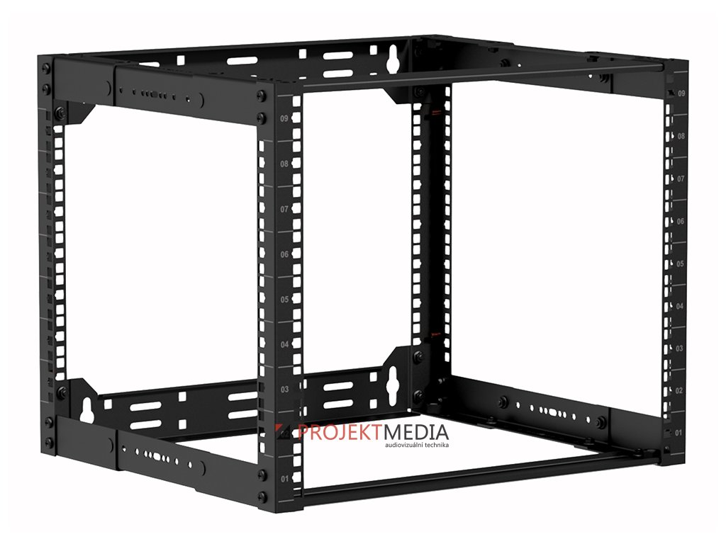 Rozvaděč 19" otevřený 9U pro stojanovou / nástěnnou / stropní instalaci nebo vestavbu do nábytku, hloubka nastavitelná v rozsahu 300-450mm, číslované výškové pozice. Materiál ocel tl. 2mm, nosnost 100kg (stojící) / 50kg (zavěšený), rozebíratelný, dodávka v rozloženém stavu. Součástí balení 4x stavitelná noha, 4x kotva do zdi M8, 24x sada klecová matka + šroub. Rozměry (ŠxVxH) 520x425x300-450mm, hmotnost 8,5kg, barva černá.