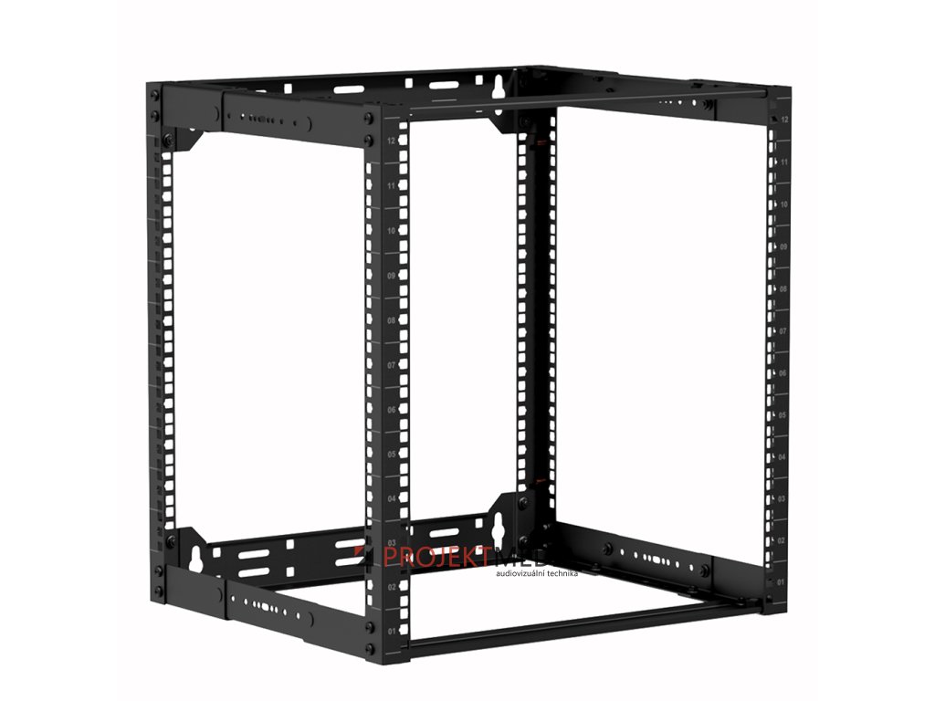 Rozvaděč 19" otevřený 12U pro stojanovou / nástěnnou / stropní instalaci nebo vestavbu do nábytku, hloubka nastavitelná v rozsahu 300-450mm, číslované výškové pozice. Materiál ocel tl. 2mm, nosnost 100kg (stojící) / 50kg (zavěšený), rozebíratelný, dodávka v rozloženém stavu. Součástí balení 4x stavitelná noha, 4x kotva do zdi M8, 24x sada klecová matka + šroub. Rozměry (ŠxVxH) 520x558x300-450mm, hmotnost 9kg, barva černá.