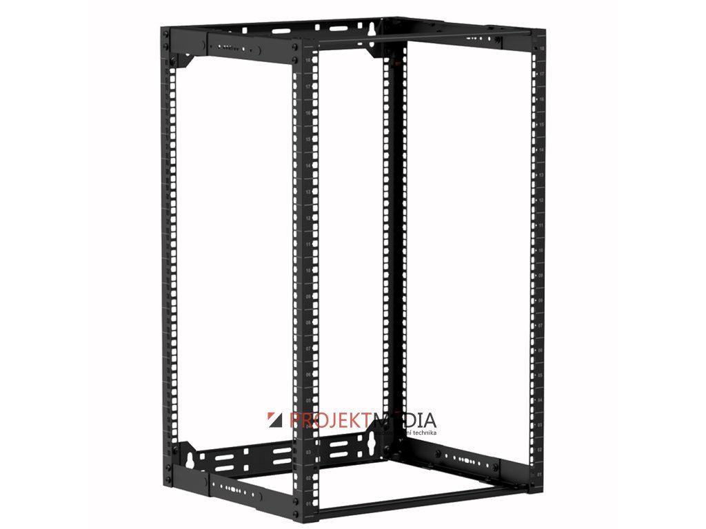 Rozvaděč 19" otevřený 18U pro stojanovou / nástěnnou / stropní instalaci nebo vestavbu do nábytku, hloubka nastavitelná v rozsahu 300-450mm, číslované výškové pozice. Materiál ocel tl. 2mm, nosnost 100kg (stojící) / 50kg (zavěšený), rozebíratelný, dodávka v rozloženém stavu. Součástí balení 4x stavitelná noha, 4x kotva do zdi M8, 24x sada klecová matka + šroub. Rozměry (ŠxVxH) 520x825x300-450mm, hmotnost 10kg, barva černá.