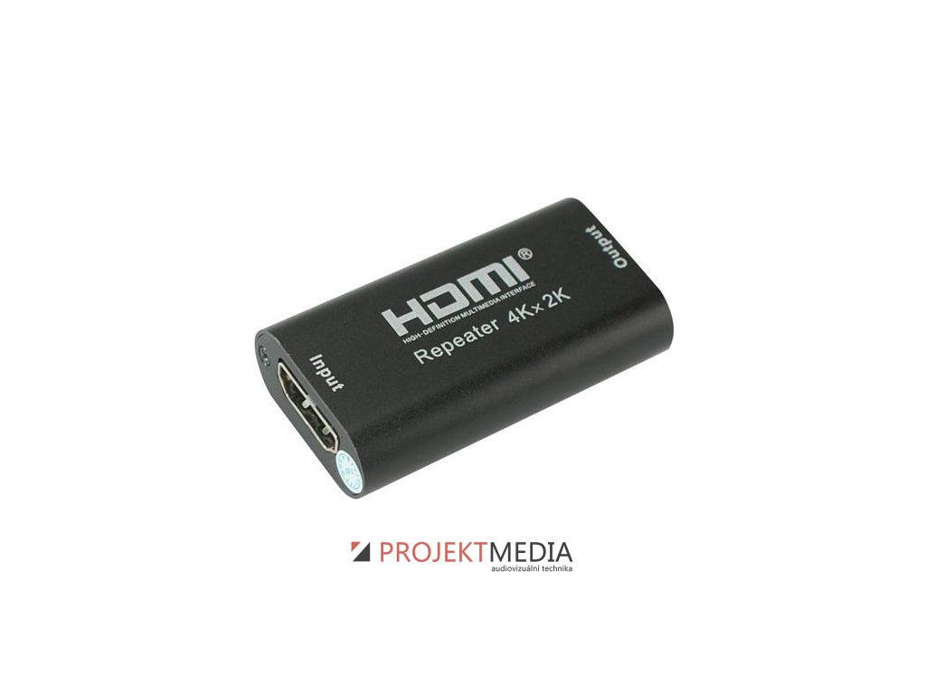 - Zapojuje se většinou do prostřed trasy mezi dva kabely, například mezi dva 20m kabely,viz příklad zapojení níže, proto konektory repeateru jsou female-female ( doporučené provedení 20m HDMI kabelu, měděný vodič 24AWG ) - Repeater zesílí a obnoví slabý signál a umožní zapojení monitoru na velkou vzdálenost. - Podporuje formát HDMI 1.4b - Podporuje 3D,4kx2k@30Hz - Kompatibilní s