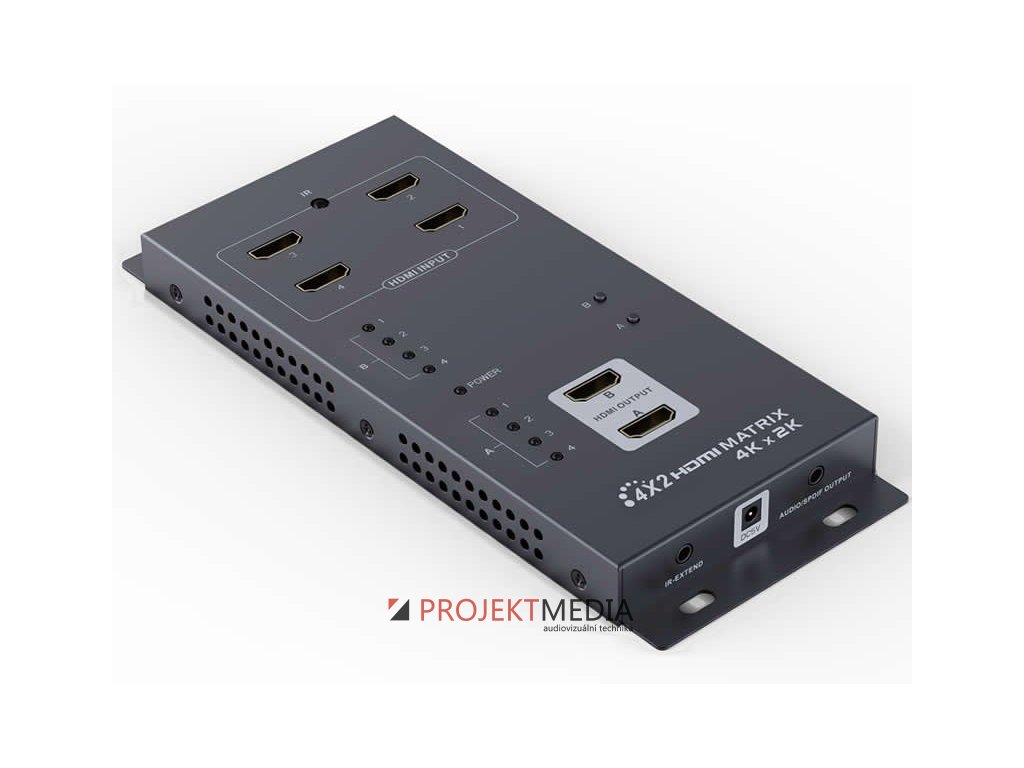 - Rozlišení: 480i, 480p, 720i, 720p,1080i,1080p, 4Kx2K@30Hz - Podpora 3D obrazu - HDMI 1.4b HDCP kompatibilní - Matrix provedení 4 vstupy a 2 výstupy - Umožní připojit více vstupů (4)/ výstupů(2) - Umožní z různých čtyř zdrojů signálů posílat signál nezávisle na dva výstupy najednou - Audio výstup stereo jack 3,5mm a SPDIF (Toslink) - Podporuje 3D a HDTV až Full HD (1080p), 4Kx2K@30Hz - VGA,SVGA,XGA,UXGA mode