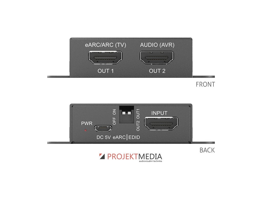 Extrakce eARC z 1 HDMI vstupu do 2 HDMI (eARC / pass-through) výstupů