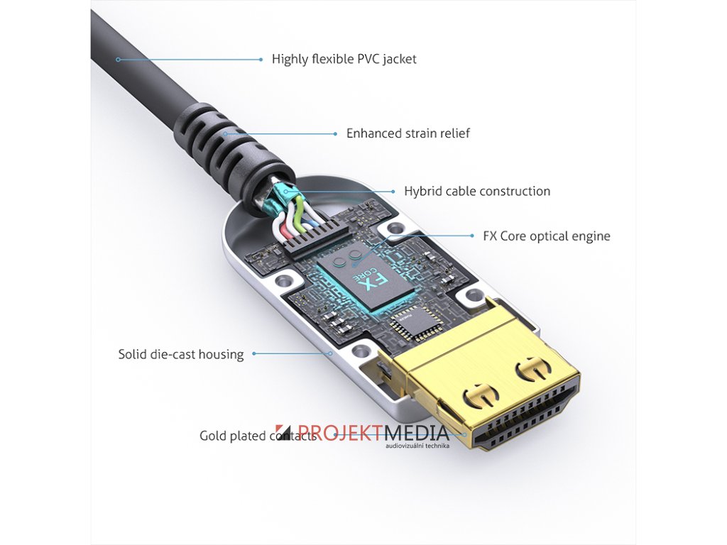 FiberX aktivní optický HDMI 2.0 kabel FX-I350, který vysílá nekomprimované audio a video signály do vzdálenosti až 100 metrů. Tento kompaktní kabel byl vytvořen pro profesionální instalace - umožňuje plnou šířku pásma 18 Gb/s se spolehlivostí 24/7 a možností jednoduchého plug and play. Kabel obsahuje jak optická vlákna tak i měděná jádra, je lehký, flexibilní a má ultra malý poloměr ohybu. Díky pokročilému optickému jádru poskytuje hybridní HDMI kabel plnou integritu HDMI signálu a podporuje CEC, transparentní EDID a HDCP a dále také nulové zpoždění snímku, žádnou latenci ani kompresi.