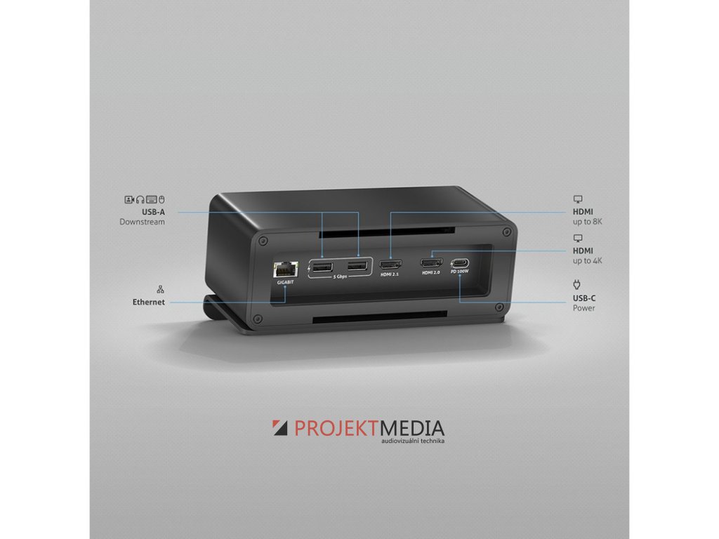 Mediahub2 dokovací stanice je navržena tak, aby poskytovala bezproblémové, ale stylové uživatelské prostředí. Díky svým inovativním funkcím a elegantnímu designu je tento produkt ideální pro všechny, kteří chtějí zlepšit svůj pracovní prostor. Přizpůsobte si nastavení displeje pomocí možnosti výstupu 8K/5K nebo dvou výstupů pro 4K. Užijte si bezproblémové připojení se 7slotovým stolním boxem, který je předkonfigurován s modulem dokovací stanice mediahub2 USB-C.