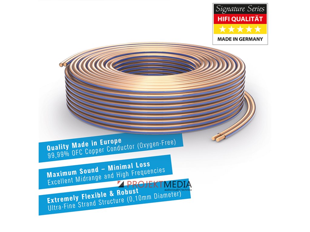 Prémiový repro kabel: průřez (2 x 4 mm²) - ultrajemná struktura pramenů (0.10mm průměr) - perfektní kombinace pro minimální ztráty a maximální kvalitu zvuku